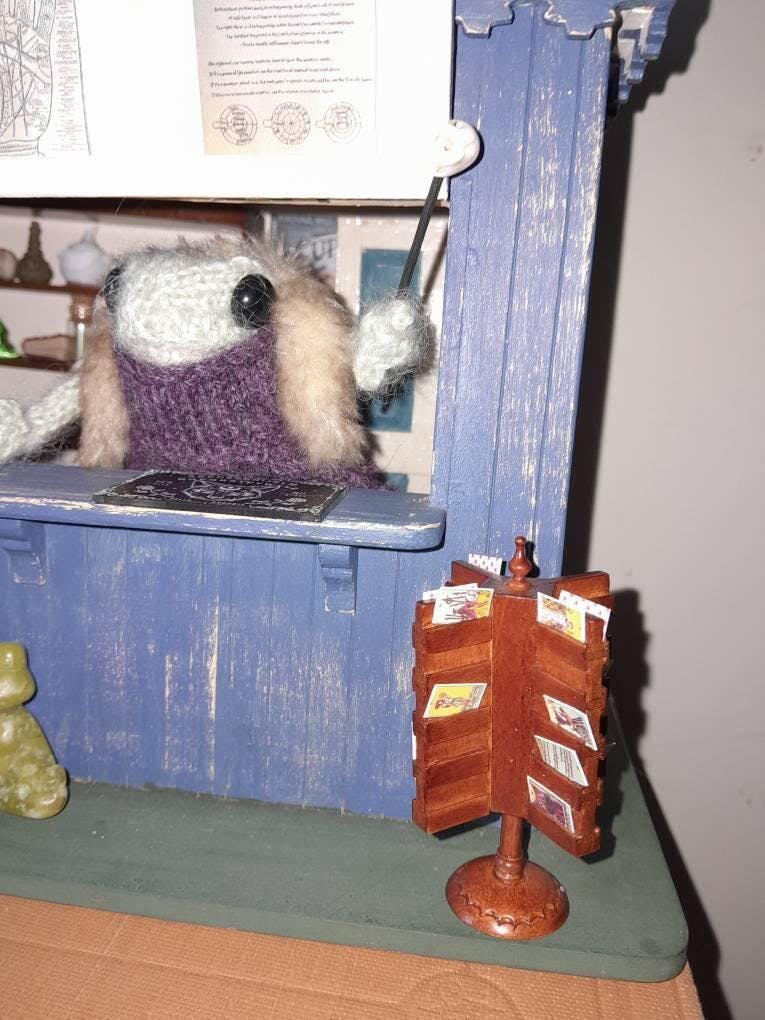 Werten Sie Ihre Miniatur-Ladenauslage mit diesem fachmännisch handgefertigten Postkartenständer im Maßstab 1:12 auf. Hergestellt aus hochwertigem Walnussholz, vereint er feine Handwerkskunst und elegantes Design, um Ihrer Puppenhausszene authentische Details und Funktionalität zu verleihen.