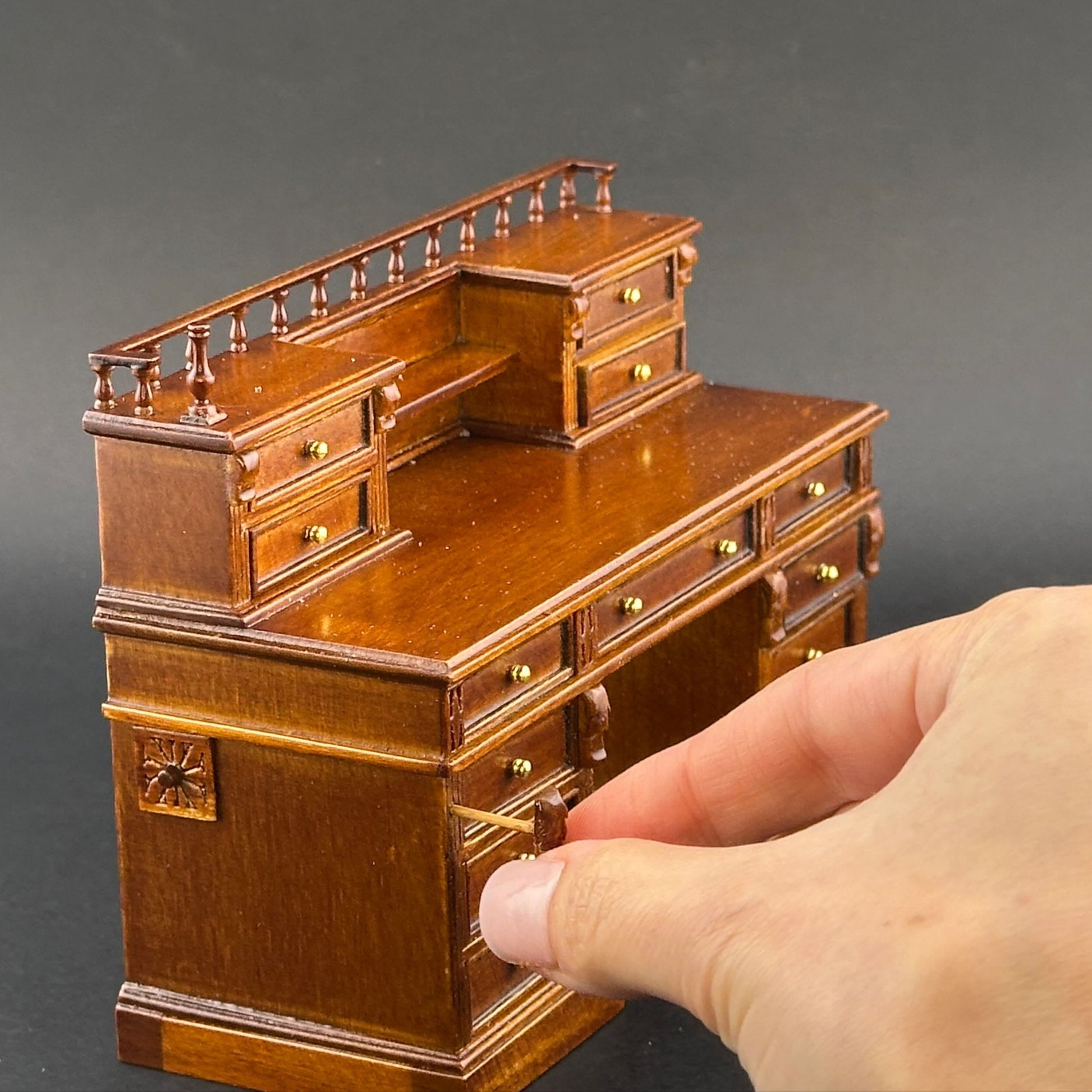 Ce magnifique bureau miniature à l'échelle 1:12 et sa chaise assortie sont inspirés d'un bureau anglais datant d'environ 1860. À première vue, le bureau semble être une pièce élégante et classique, mais à l'intérieur se cachent cinq éléments secrets , transformant cet ensemble en une expérience interactive au-delà de sa beauté.