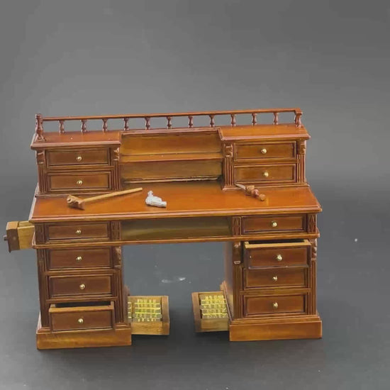 Ensemble bureau et chaise miniature victoriens à l'échelle 1:12 avec tiroirs secrets, lingots d'or, compartiments cachés et accessoires – Style anglais 1860