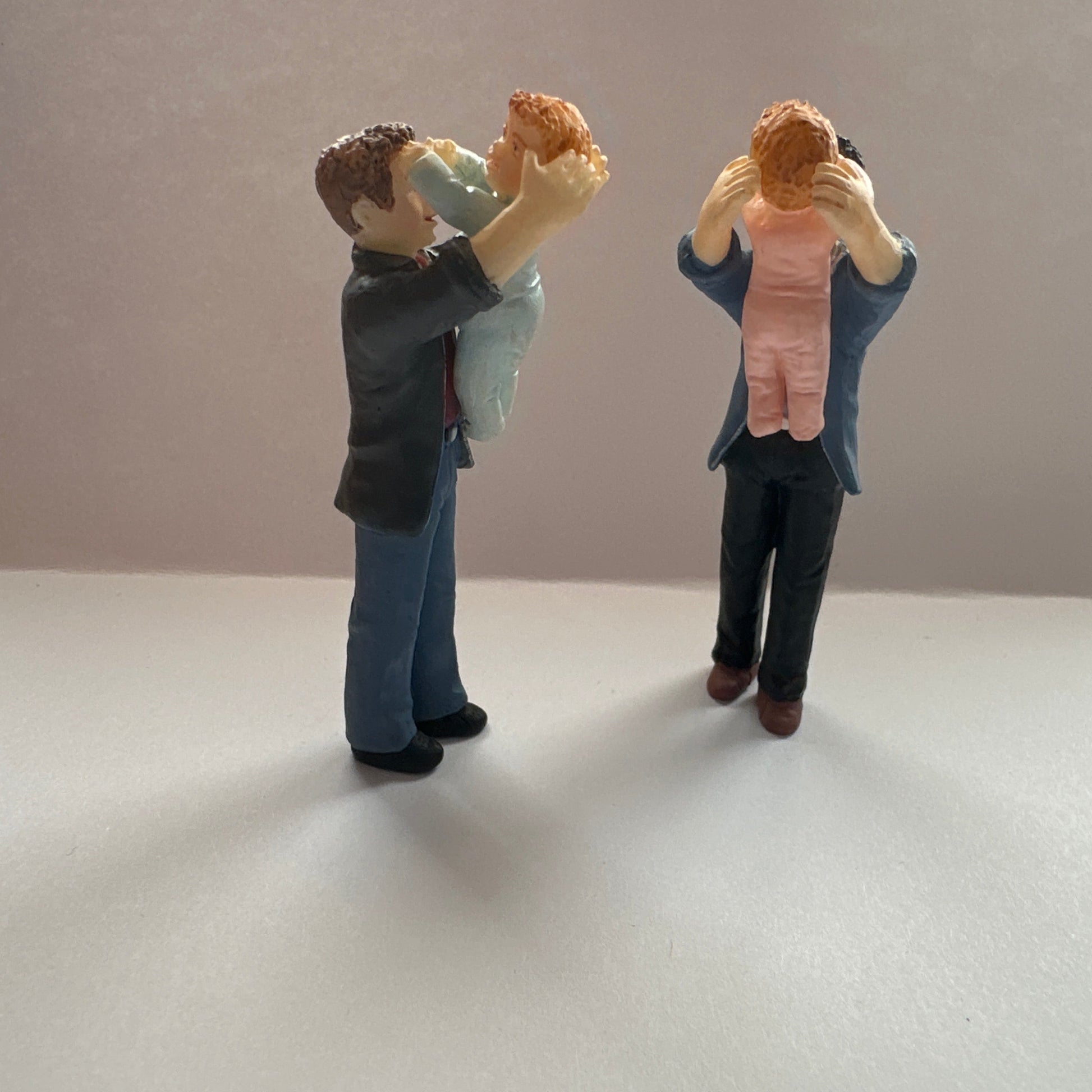 The babies are separately crafted, one dressed in burgundy (possibly a girl) and the other in blue, slightly reddish, very cute. They can be removed from the fathers’ hands and placed back, allowing interactive posing.