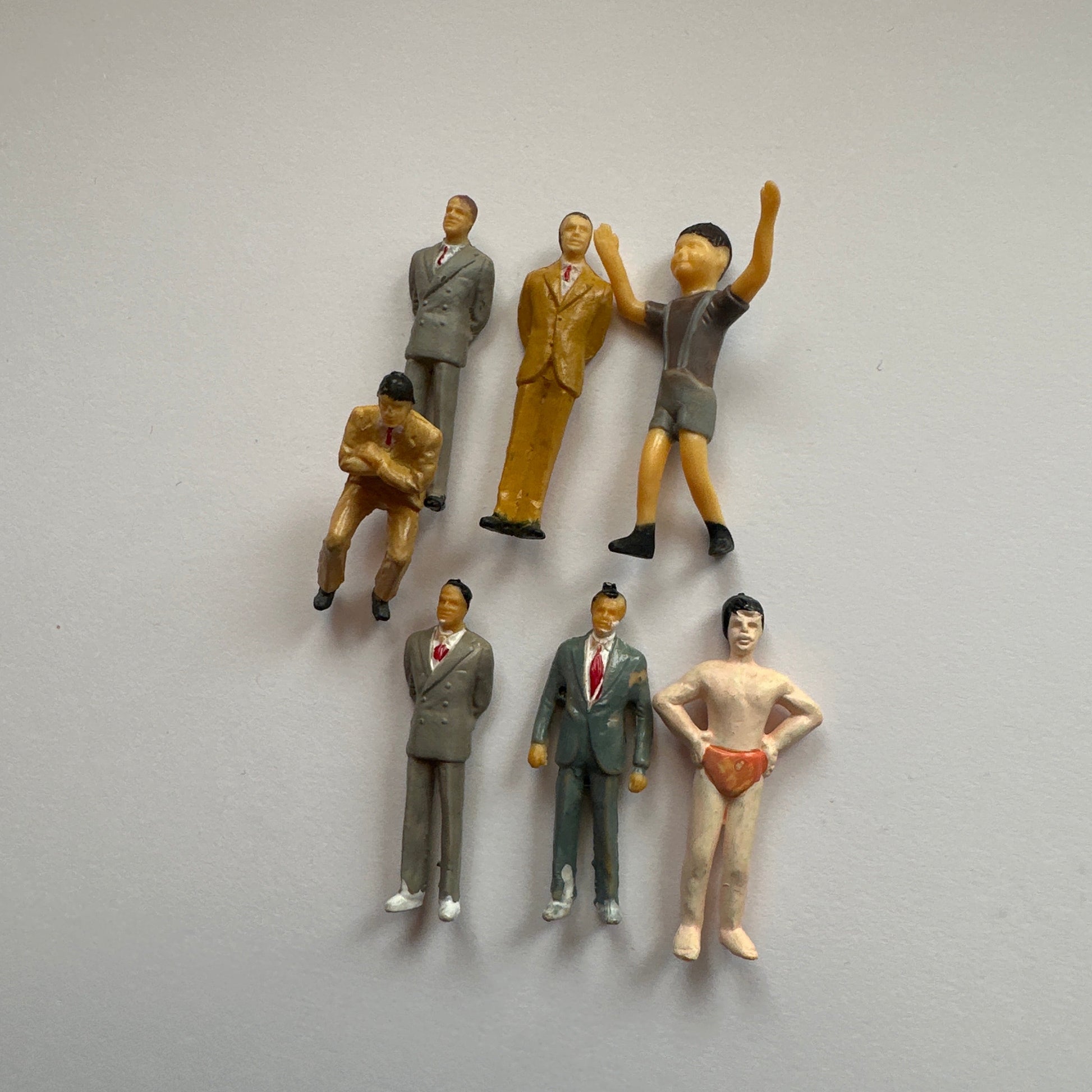 This set of small 1:24 scale miniature figures, approximately 3 cm tall, features a variety of characters in different outfits. Three men are included, each in a distinct suit: one gray, one mustard with black shoes seated naturally, and one blue with a red tie. There is also a child wearing short pants and a short-sleeved shirt with black shoes, as well as a figure resembling Tarzan in swimwear. Each figure is finely detailed, capturing realistic poses and clothing.
