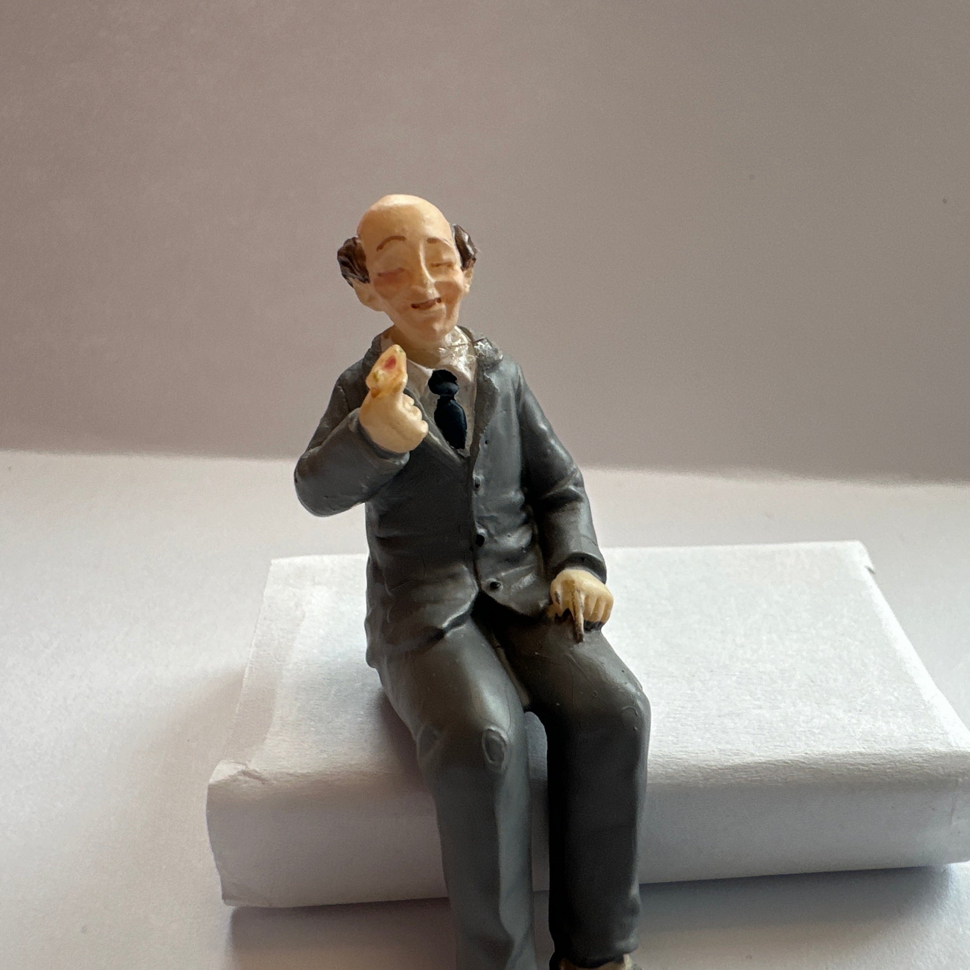 A charming 1:24 scale miniature doll of a seated grandfather, dressed in a gray suit with a matching tie. The grandpa is partly bald, with a calm and friendly expression, and he appears to be holding a small sandwich. His seated pose looks natural and full of character, and the fine attention to detail makes this figure a perfect addition to any miniature home scene — dining room, living room, or garden corner.