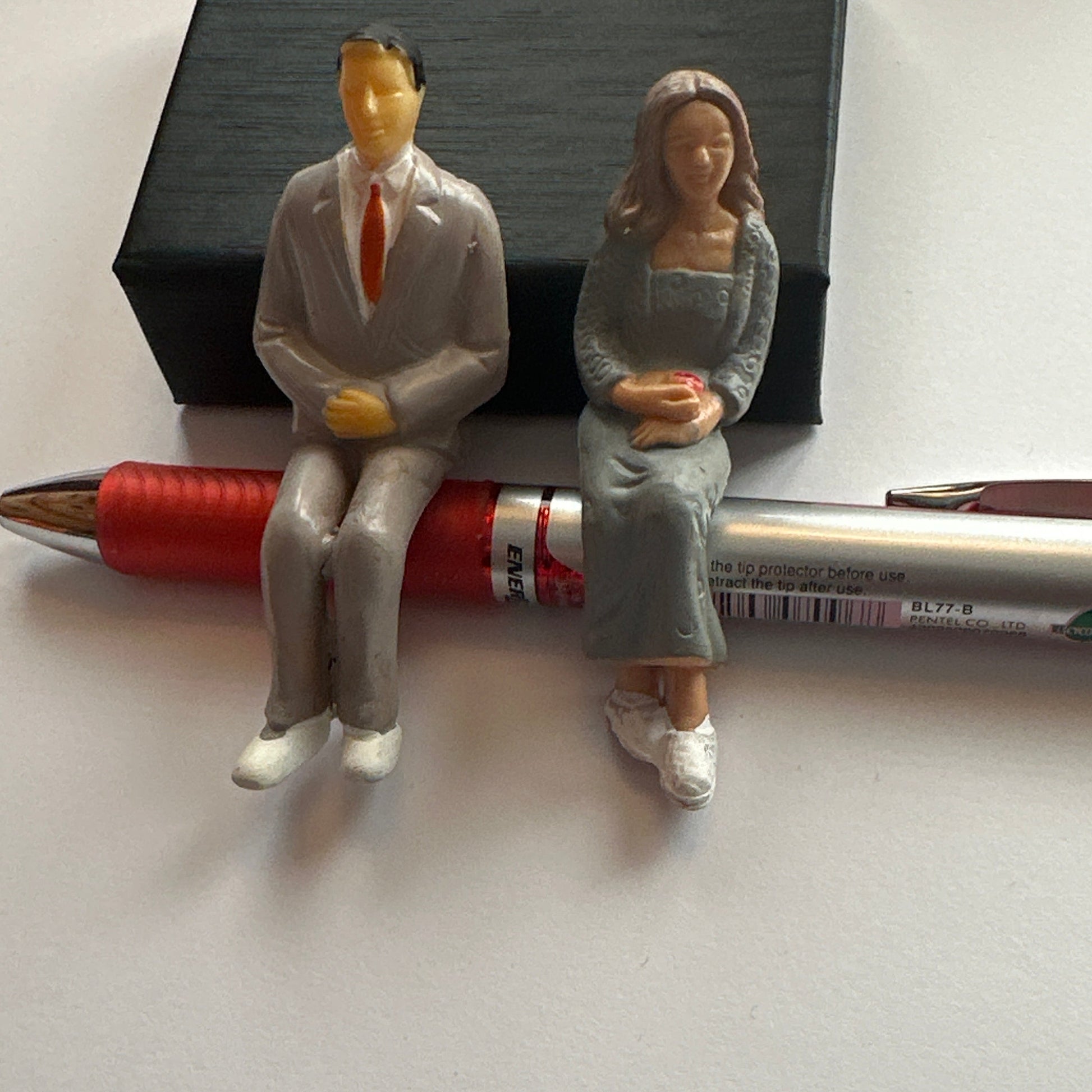 This 1:24 scale miniature set features a man and woman dressed in matching gray outfits, perfect for dollhouse scenes. The male figure wears a gray suit with a red tie, white shoes, and a black hat, seated naturally. The female figure is dressed in a gray dress with white shoes, brown hair neatly styled, holding a red apple in her hand. Both figures are beautifully detailed, capturing a classic and elegant moment for miniature displays.