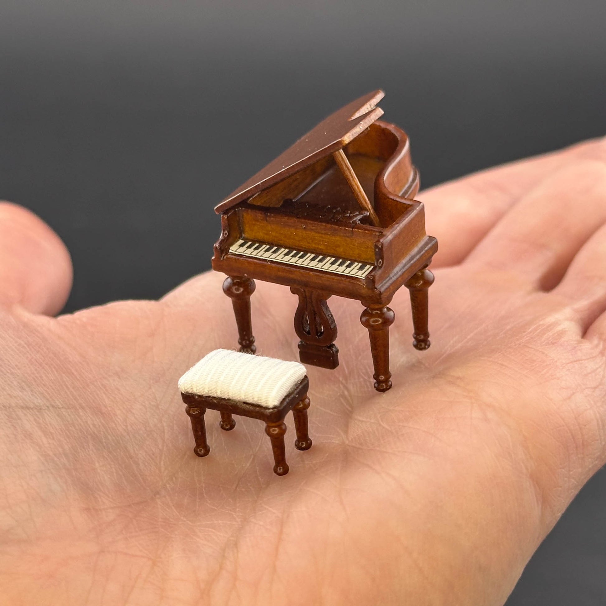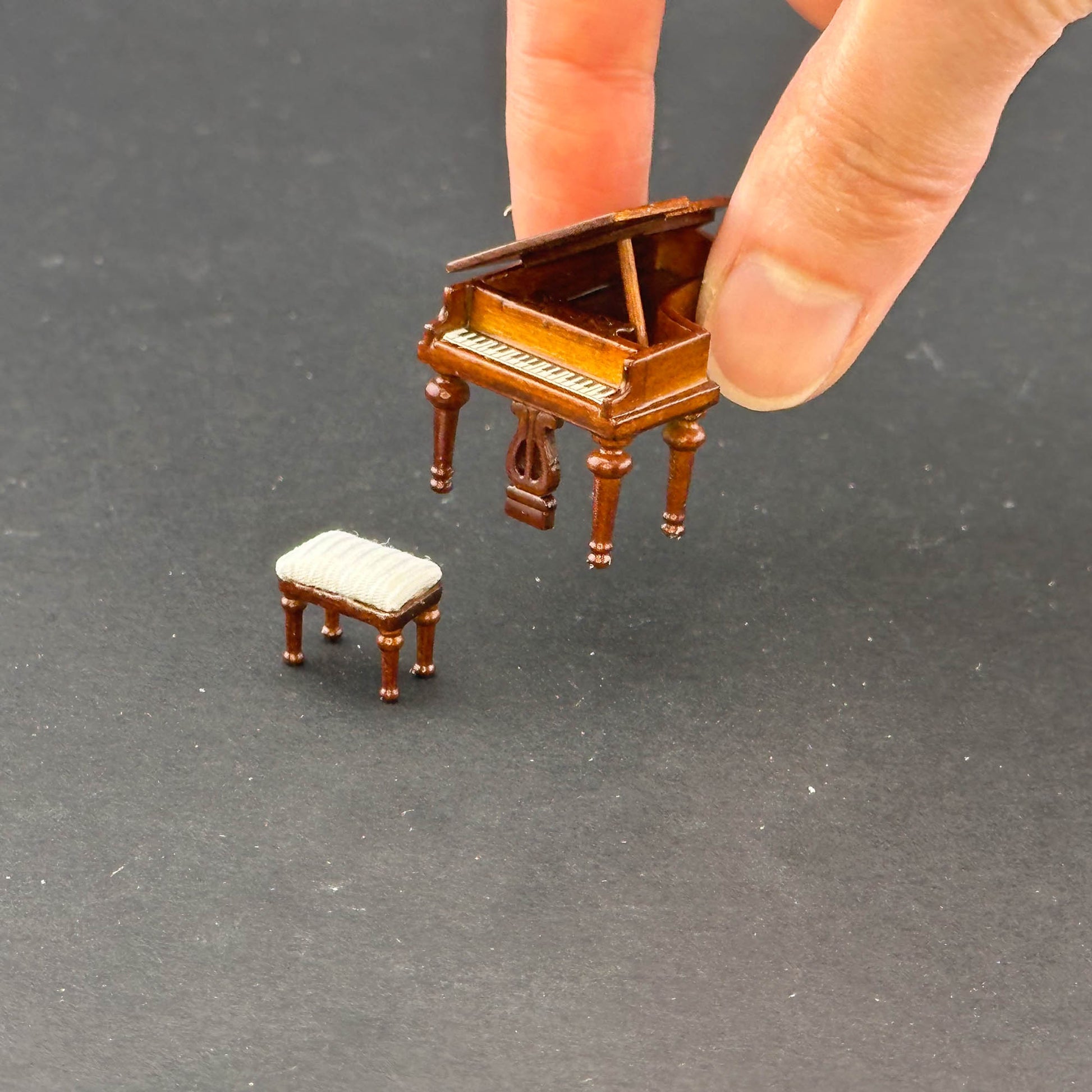 Enhance your miniature music room with this top-quality 1:48 quarter scale piano and stool set, crafted from rich mahogany. Expertly detailed and elegant, this handcrafted miniature brings authentic charm and refined sophistication to any dollhouse setting, making it a captivating centerpiece for collectors who appreciate timeless style.