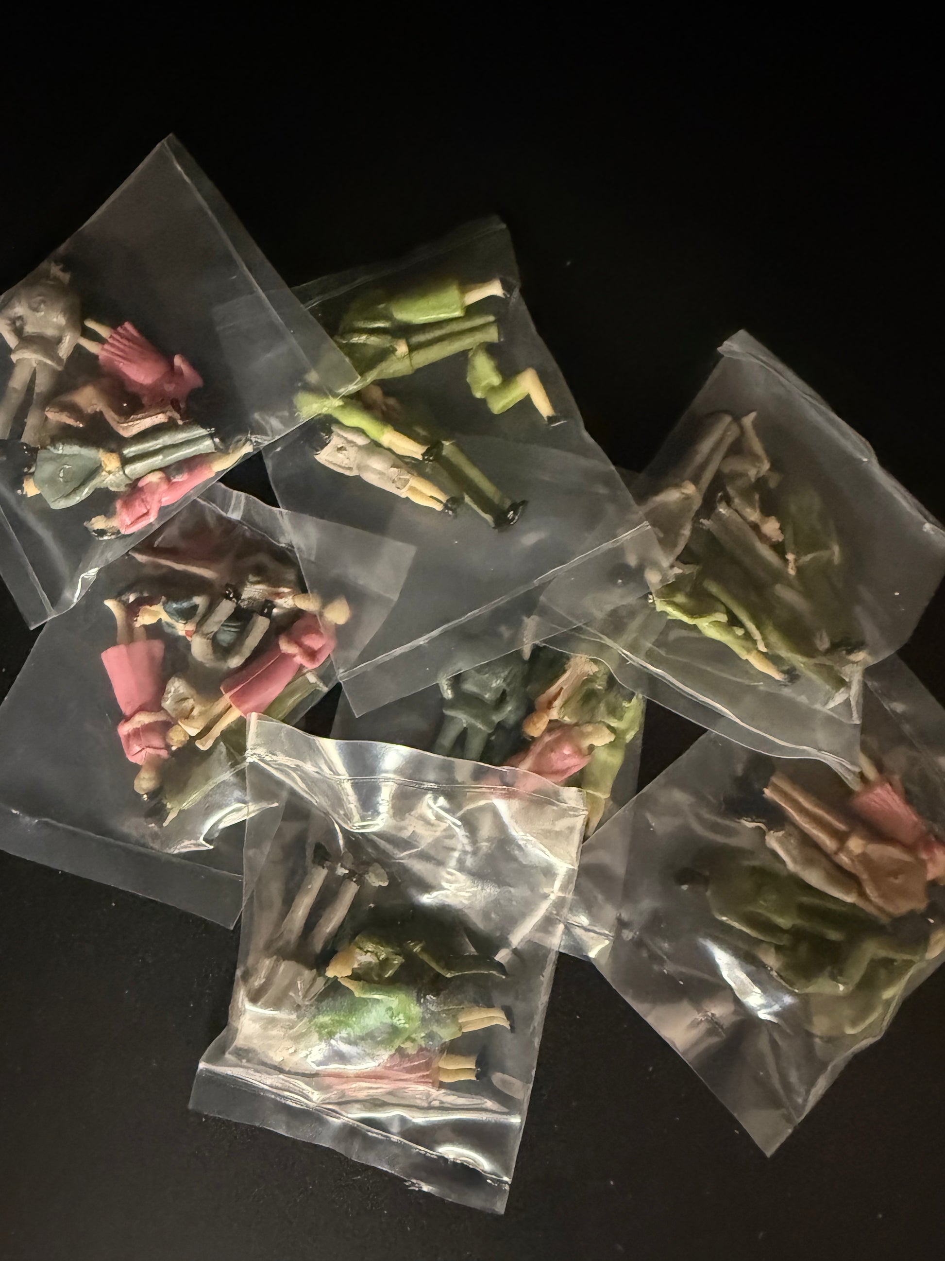 A random collection of 1:48 scale figurines in a mixed combination of women, men, children, and elderly people. The photo is for illustration purposes only. This is an economy set, and specific figurines or specific colors cannot be requested.