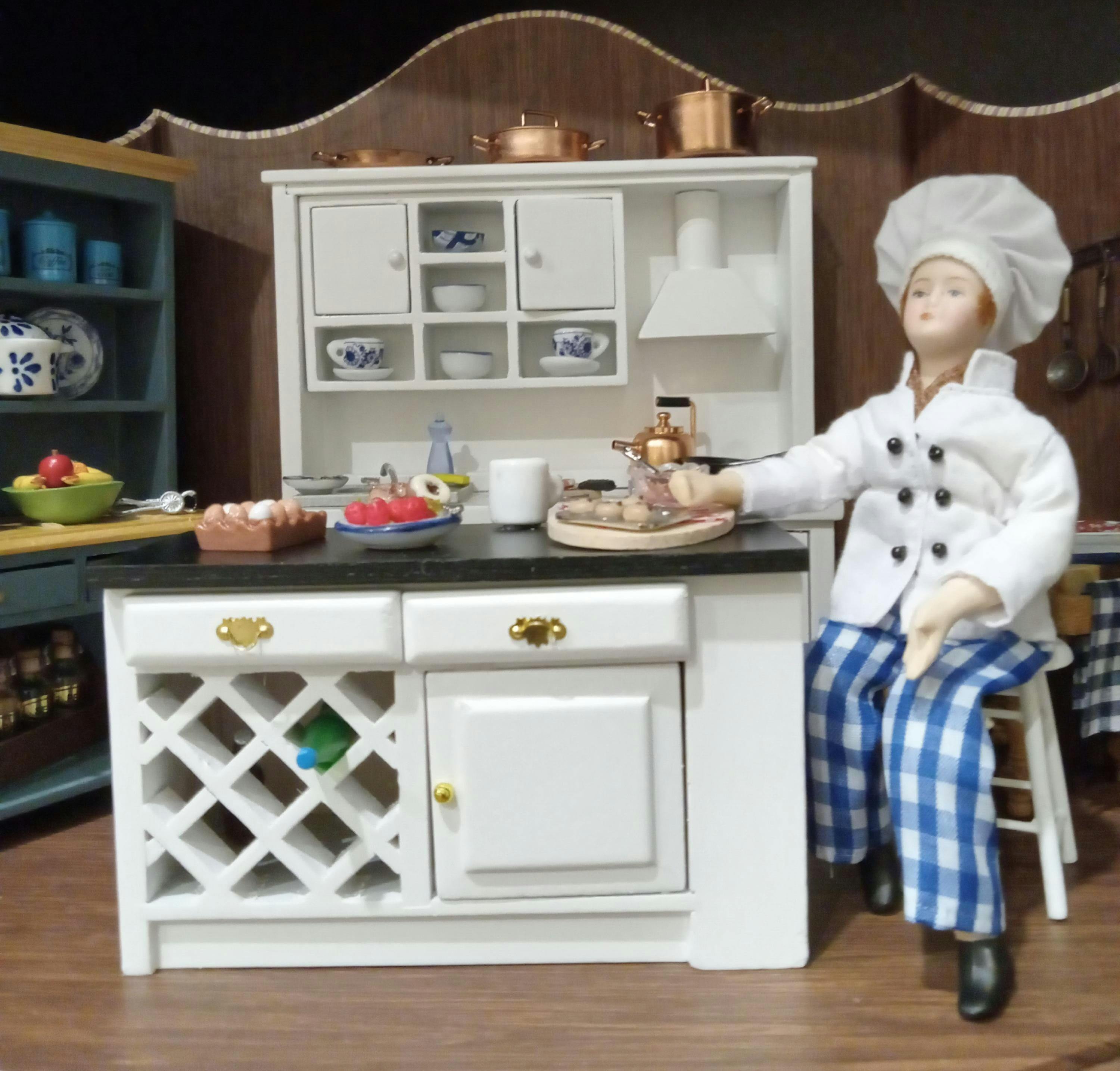 Laura Charming chef for a shadowbox kitchen. Very well made mini doll. Great detail. This vendor never disappoints