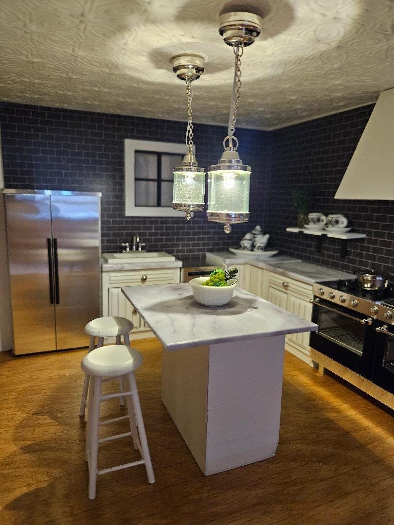 Our lights are designed for 1:12 and 1:6 scales (sizes specified in the product title). All ceiling and wall lights attach with a miniature disk magnet, which comes included with the lights.