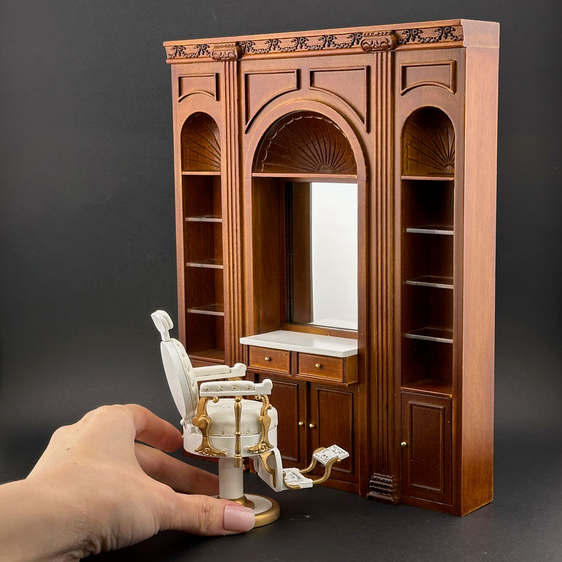 This panel is part of the Manor Series collection and is designed to match the rest of the panels in height, color, and width. It is a multi-purpose unit, featuring two side shelves framing a central section with a mirror, two drawers, storage cabinets, and our signature decorative shell motif. This versatile piece can serve various functions, including use as a barber shop wall, where it pairs beautifully with our new barber chair. A truly flexible item that can enhance any miniature project. Crafted to the highest standard of quality.