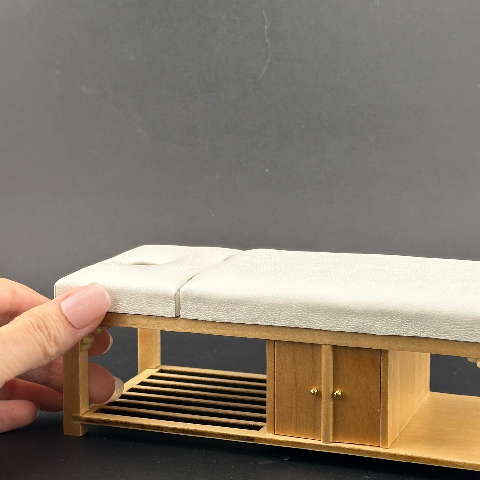 This beautifully crafted 1:12 scale miniature massage or treatment bed is perfect for adding realistic detail to your dollhouse spa or wellness room. The bed is made from solid oak wood and upholstered with elegant white leather. It features a headrest with a face hole that can be covered with a matching cushion for added realism.