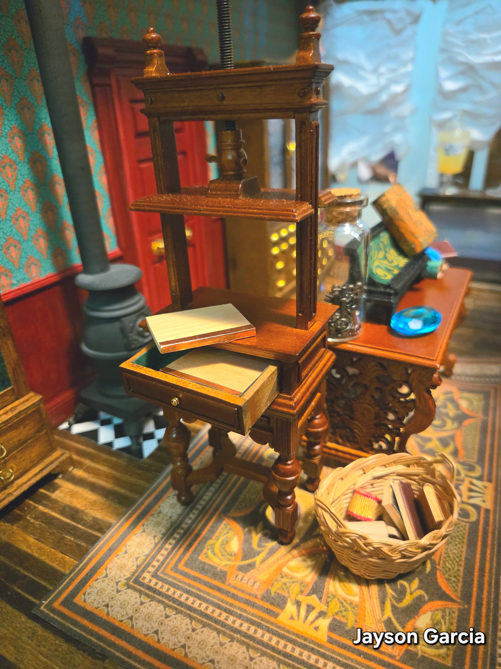 The miniature features elegantly turned legs and a functional screw mechanism that raises and lowers the top plate. While decorative, it adds a layer of authenticity and character to any artisan or period dollhouse scene.
