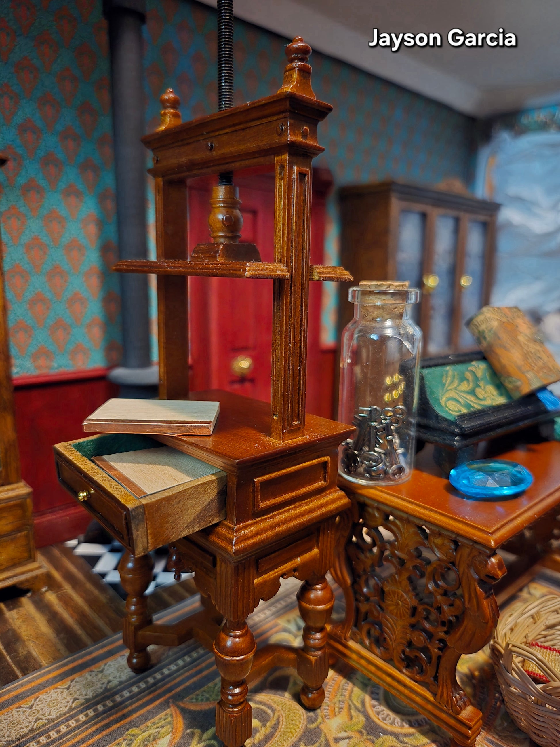 Bring timeless craftsmanship to your dollhouse or collector’s shelf with this beautifully detailed miniature book press. Crafted from walnut wood with a working metal screw, this piece is a faithful 1:12 scale replica of a traditional bookbinding or blanket press.