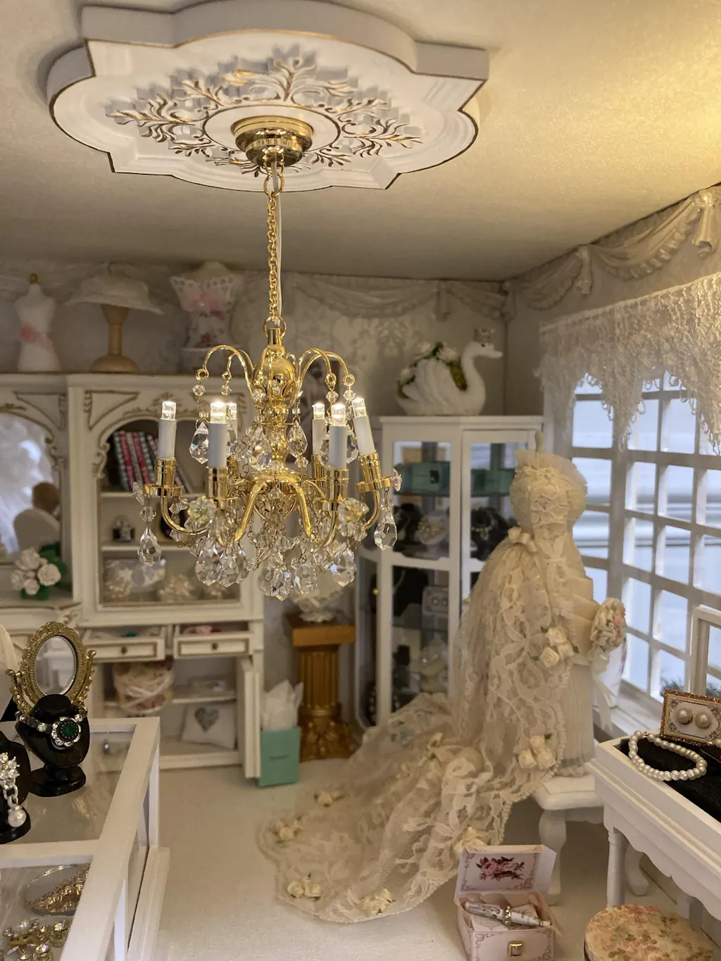 BRASS Crystal chandelier 6 arms Miniature Touchless operation with Wand 1:12 scale for dollhouse No-touch No-Switch
