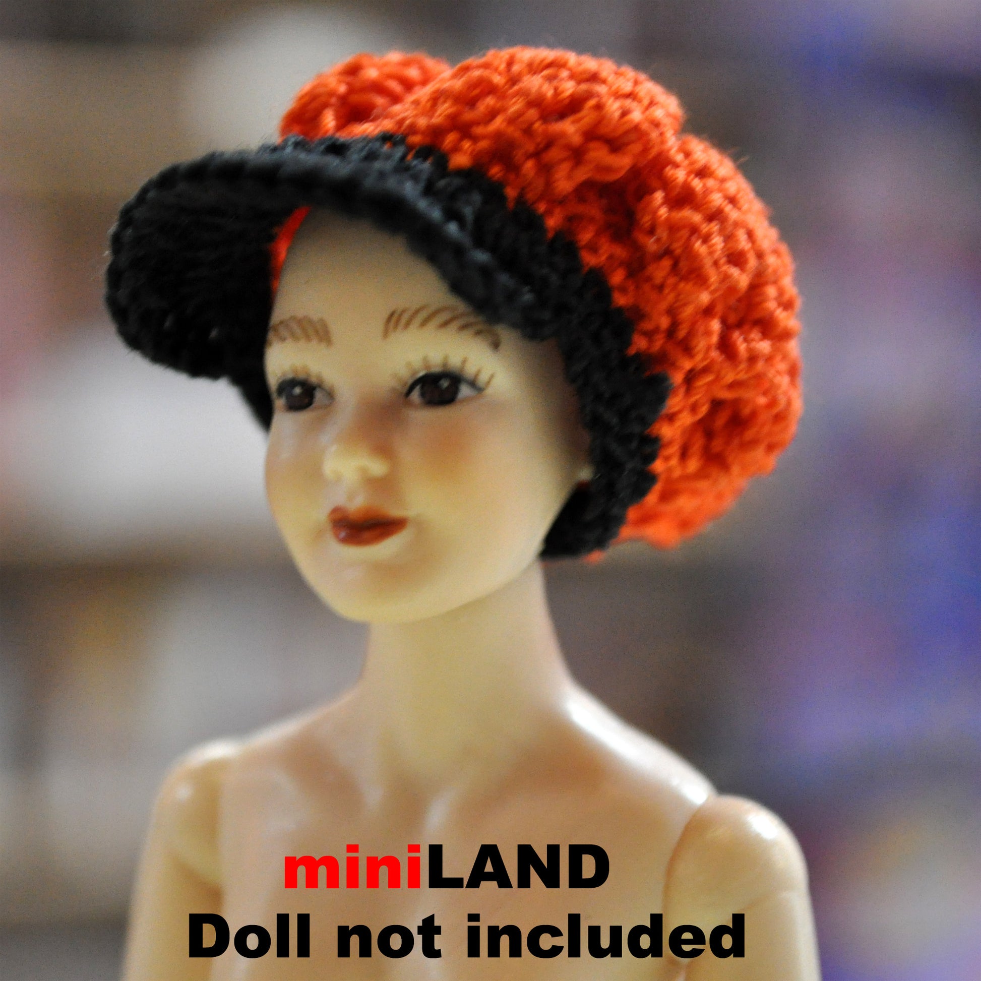 A unique handmade crocheted cap, carefully crafted with a striking color combination: the body of the cap is warm orange, while the visor is black. The visor itself is crocheted, blending seamlessly with the cap’s design. The size is approximately 3 cm by 2 cm (about 1.2” x 0.8”), making it perfect for dollhouses or miniature collections. A charming piece that adds color and character to tiny outfits.