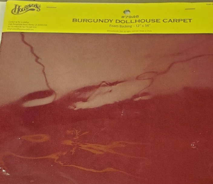 Enhance your dollhouse with this 1:12 scale burgundy carpet, measuring 12” x 14”. Its foam-backed design provides a plush, cushioned feel, adding realism and comfort to any miniature room. Perfect for creating a warm, inviting atmosphere, this rich-colored carpet complements a variety of dollhouse styles while protecting delicate surfaces. Elevate your miniature décor effortlessly with this durable and stylish floor covering.