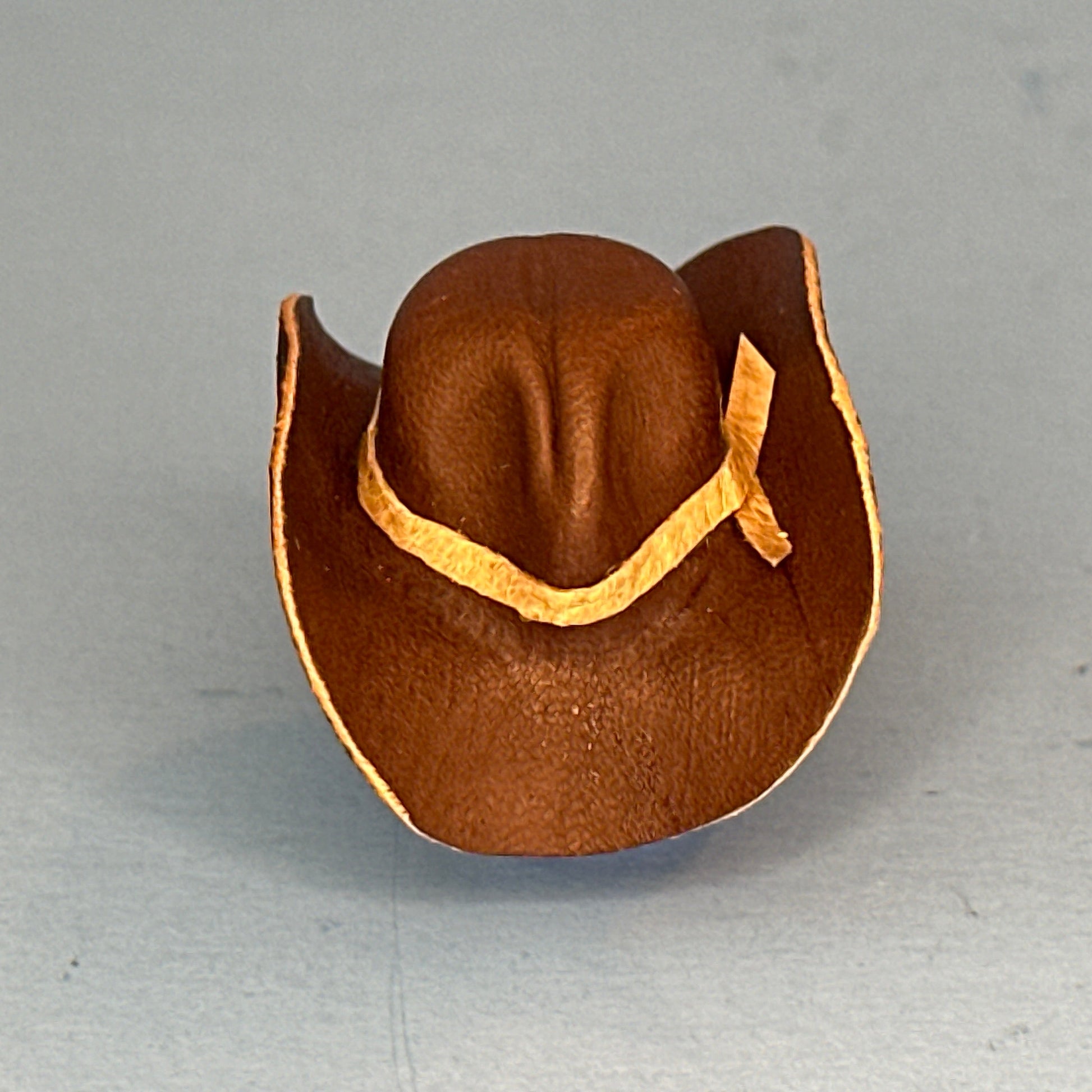 A finely crafted 1:12 scale cowboy hat in rich brown, accented with a lighter brown insert for added detail. Perfect for dollhouse collections, this miniature accessory brings a touch of western charm and character to any scene.