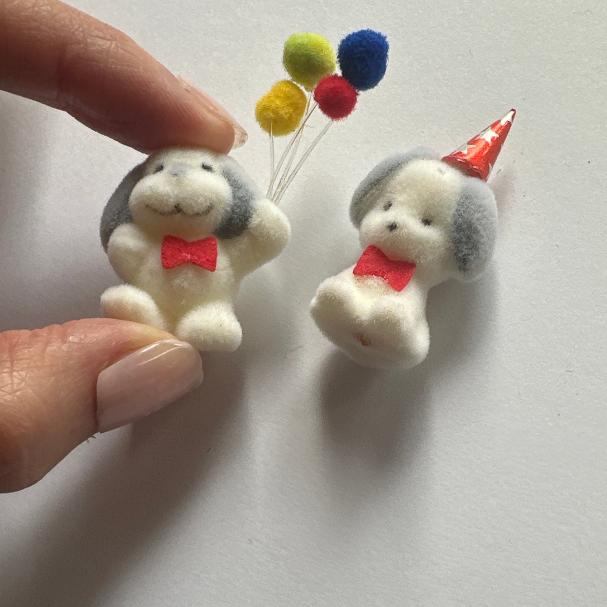 Adorable set of two tiny puppies, approximately 2.5 cm long, perfect for 1:12 scale dollhouses. One puppy is white with blue ears and a red bow, wearing a festive birthday hat (red triangle with stars), while the other puppy holds four colorful balloons. Made from a lightweight, durable material, these charming little puppies are ideal for birthday or party-themed dollhouse displays. Very cute and highly detailed, coming as a set of two for miniature collectors.