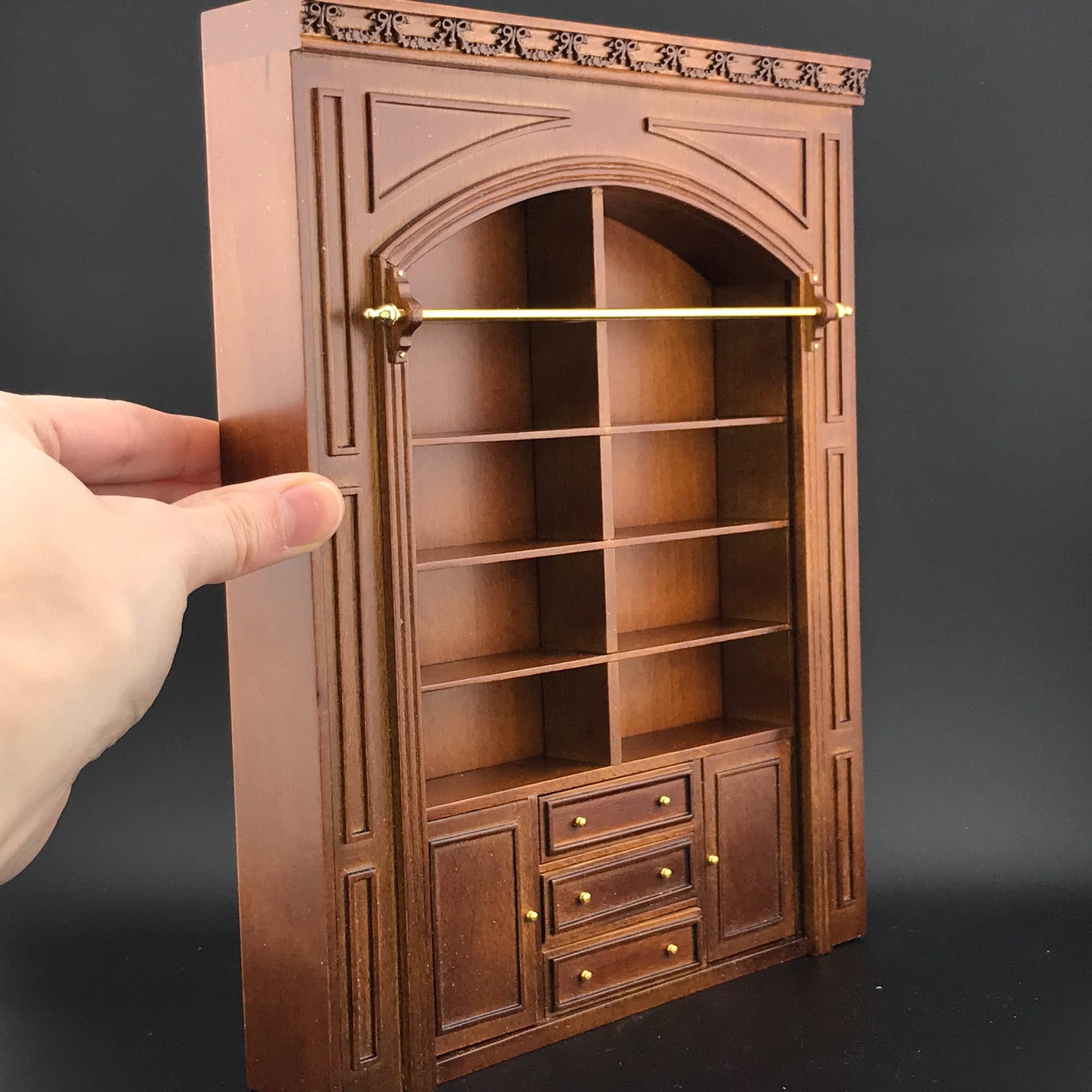 Enhance your dollhouse with the MANOR PANEL shelving unit, a sophisticated ladder-style library wall panel crafted from rich walnut wood at a 1:12 scale. This elegant bookcase brings warmth and character to any miniature room, perfectly blending style and practicality. Its timeless design invites you to create a refined, charming space that feels both inviting and thoughtfully curated.
