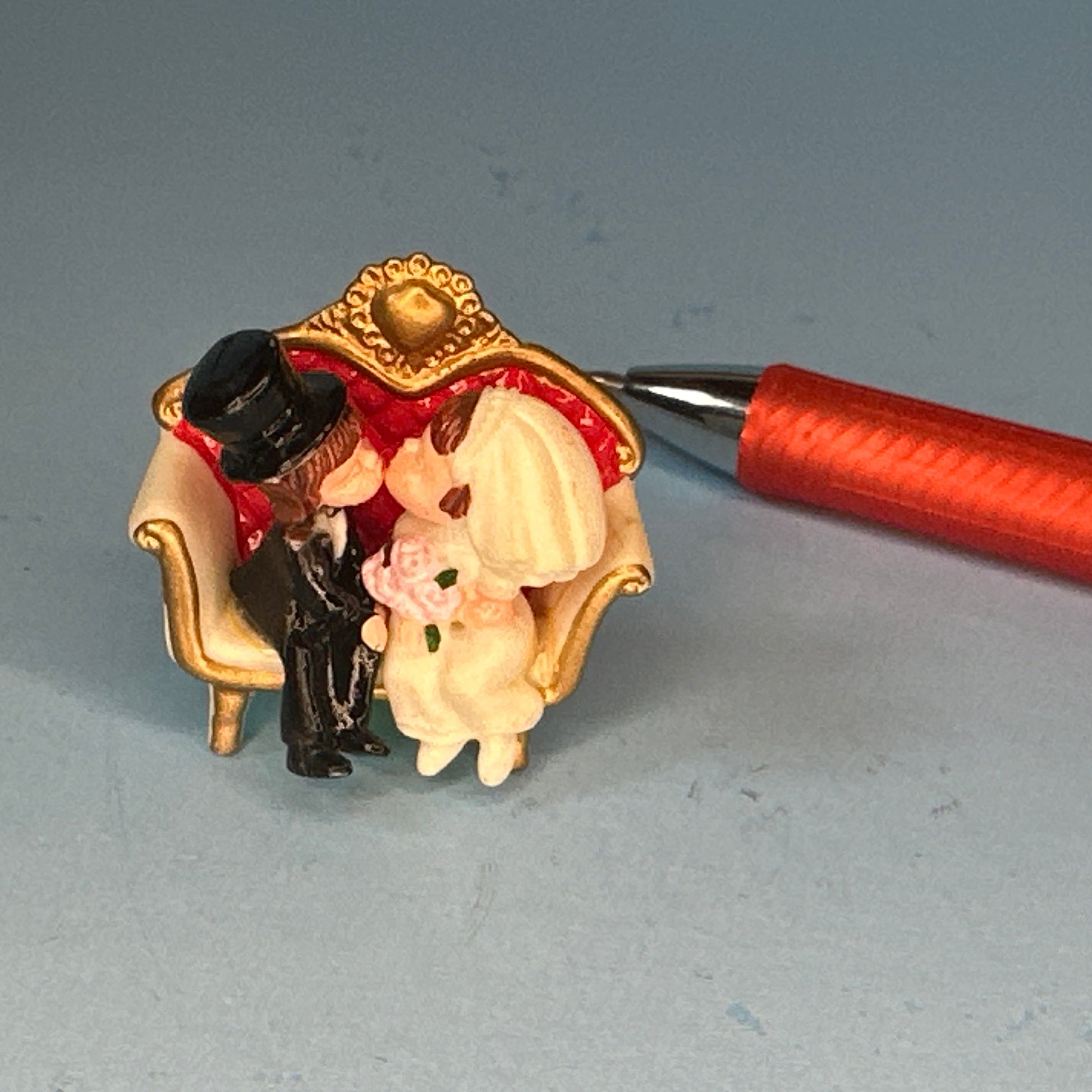 A beautiful miniature scene featuring a bride and groom seated on a bench, sharing a romantic kiss. The bride is dressed in classic white, while the groom wears an elegant black suit. The bench itself is finely crafted with a white seat, a red backrest, and a gold-colored frame, adding a touch of charm and sophistication. Perfect for wedding or romantic displays in your 1:12 scale dollhouse