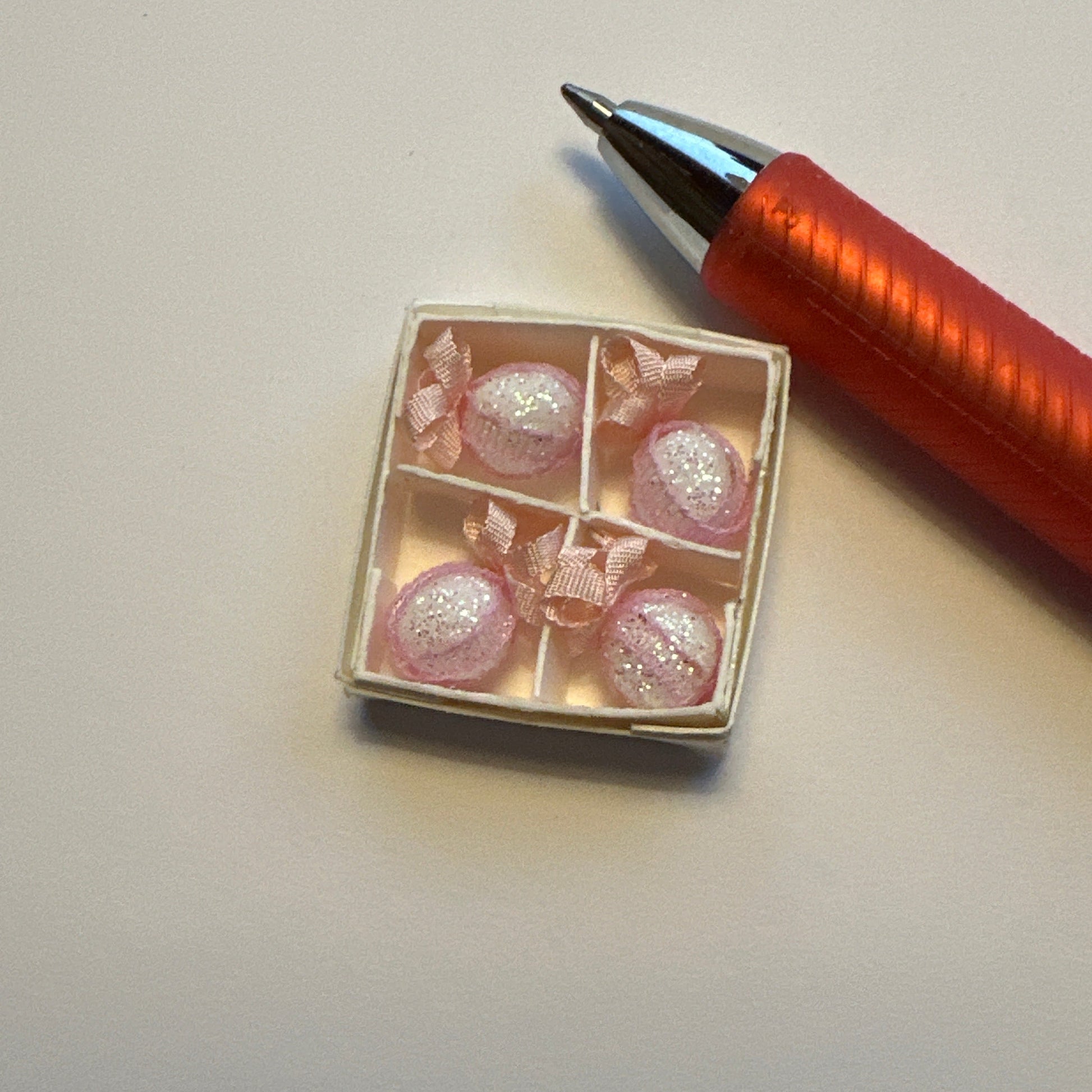 This charming set includes four tiny decorative baubles in a soft pink color, each adorned with a pink ribbon shaped like a flower. The surface of the ornaments is frosted for a festive snowy look. The ornaments come in an open display box, adding an authentic touch. Made from durable, high-quality materials, they are perfect for decorating miniature Christmas scenes. Each ornament measures approximately 2.5 cm by 2.5 cm, ideal for dollhouses and 1:12 scale collections.
