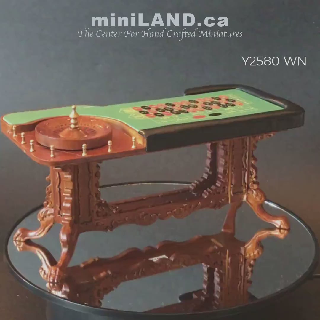 Made of wood and finished in walnut. The Roulette Table measures 3-1/4"H x 3-1/4"W x 7"L, has green silk printed cover and is accented in black leather. The numbers on the Roulette Wheel are actually carved, the wheel does turn and a little gold ball is included to complete the table. Perfect for your miniature casino or saloon.