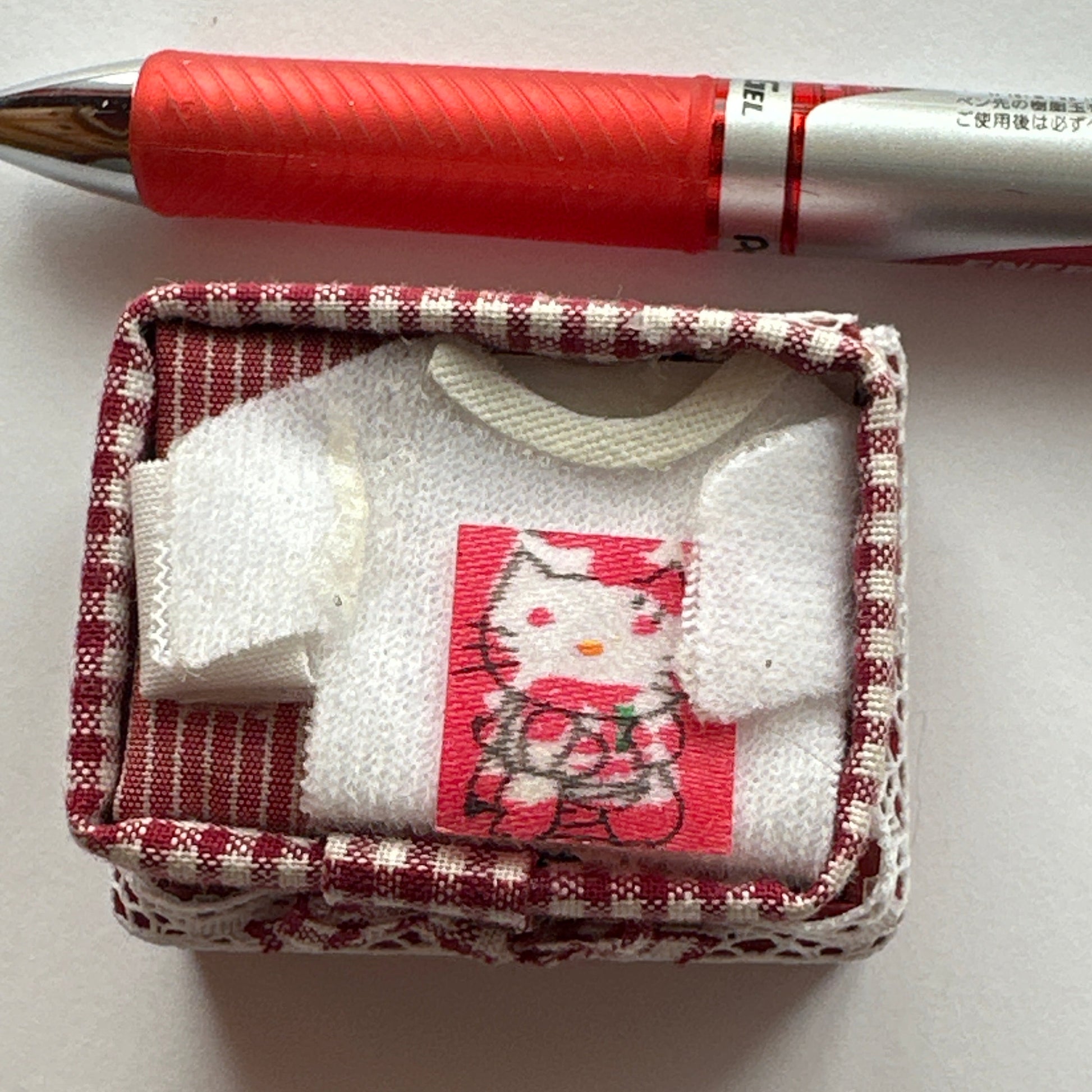 Charming 1:12 scale miniature baby clothes crate in a red checkered pattern, decorated with small red and white flowers and delicate lace around the edges. The crate comes with a tiny doll placed on top, featuring a small animal design, perfect for adding a realistic and adorable touch to any dollhouse nursery scene.