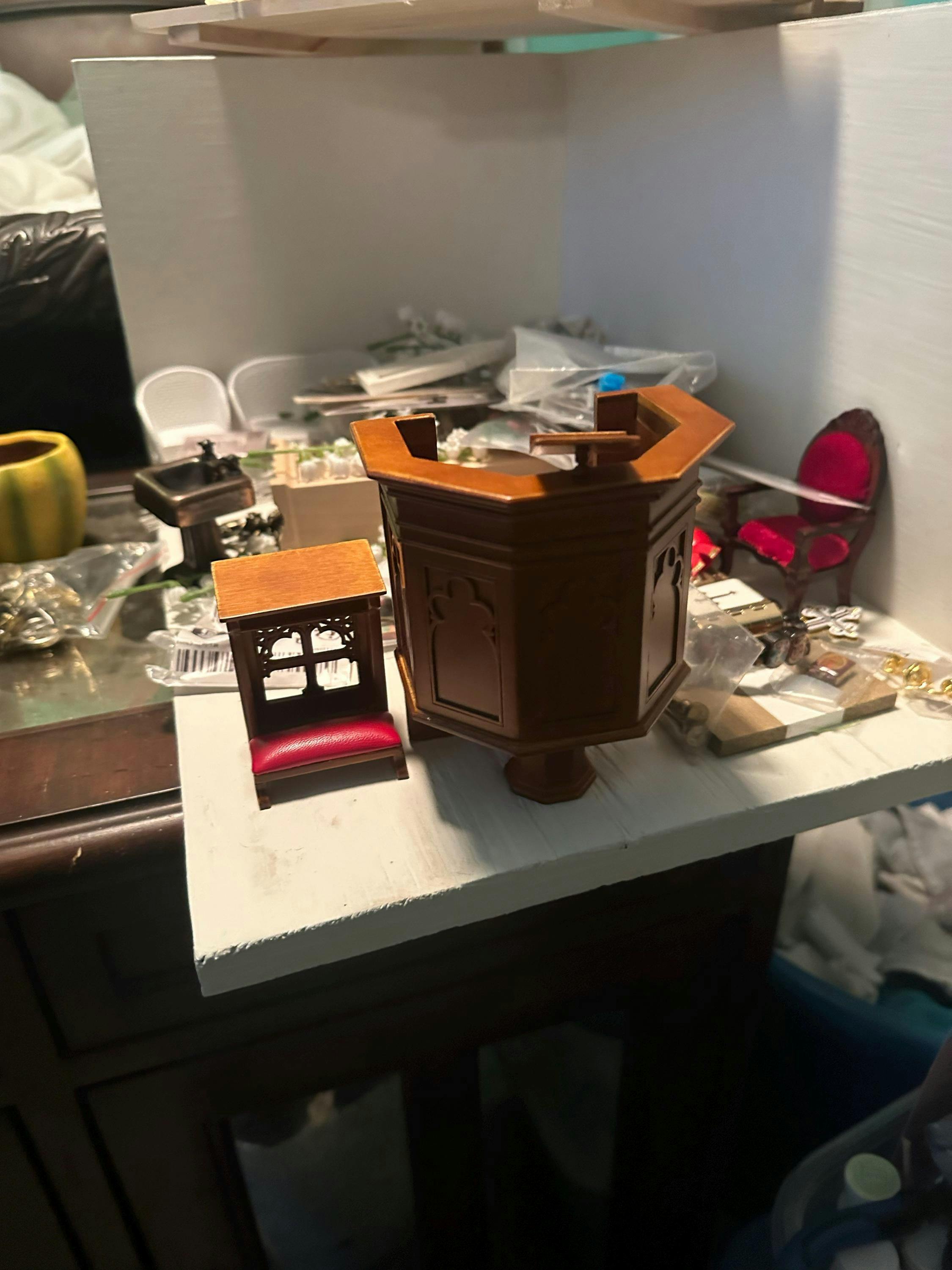 I am absolutely thrilled with my purchase of the Pulpit for my dollhouse church! The craftsmanship and attention to detail are outstanding. The walnut finish adds an elegant touch, and it fits perfectly into my 1:12 scale miniature setting. It's the perfect focal point for my dollhouse church, adding authenticity and charm to the space. The quality of the workmanship is exceptional, and it arrived beautifully and carefully packaged.
