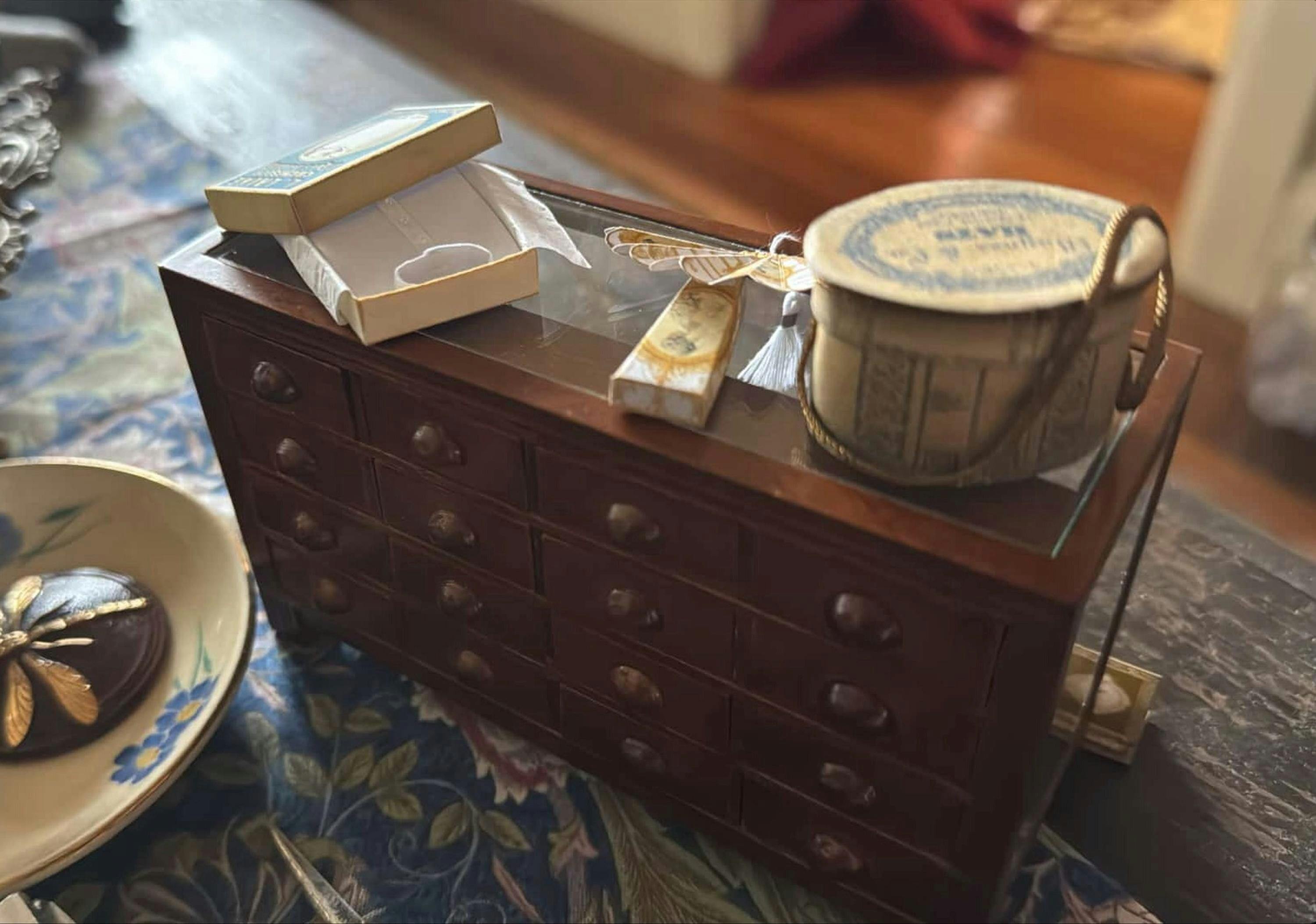 Add playful vintage character to your dollhouse with this Art Deco haberdasher store counter. Crafted from rich walnut wood at 1:12 scale, it features 16 drawers and captures the stylish essence of the 1900–1950 era, making it a perfect centerpiece for any miniature shop scene.