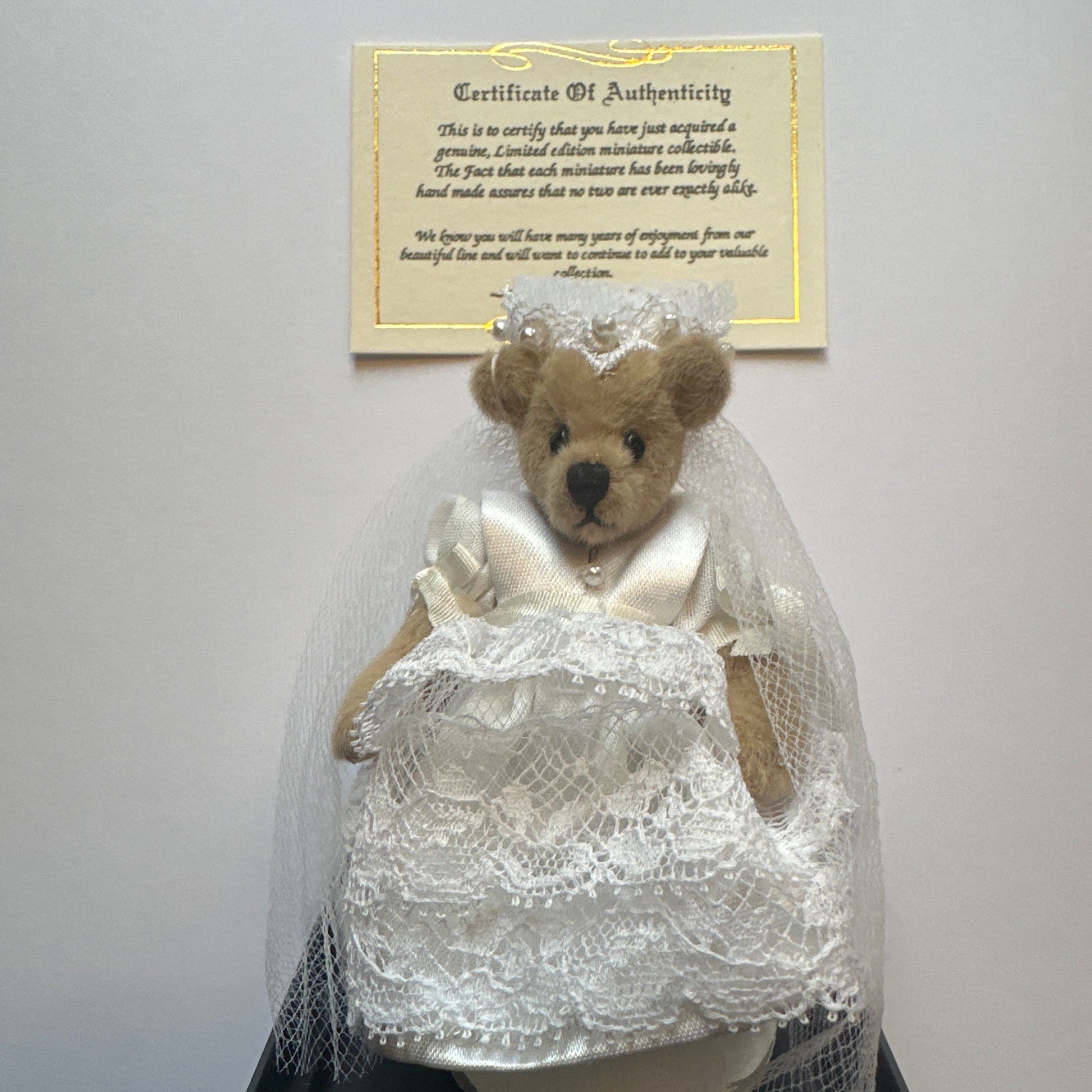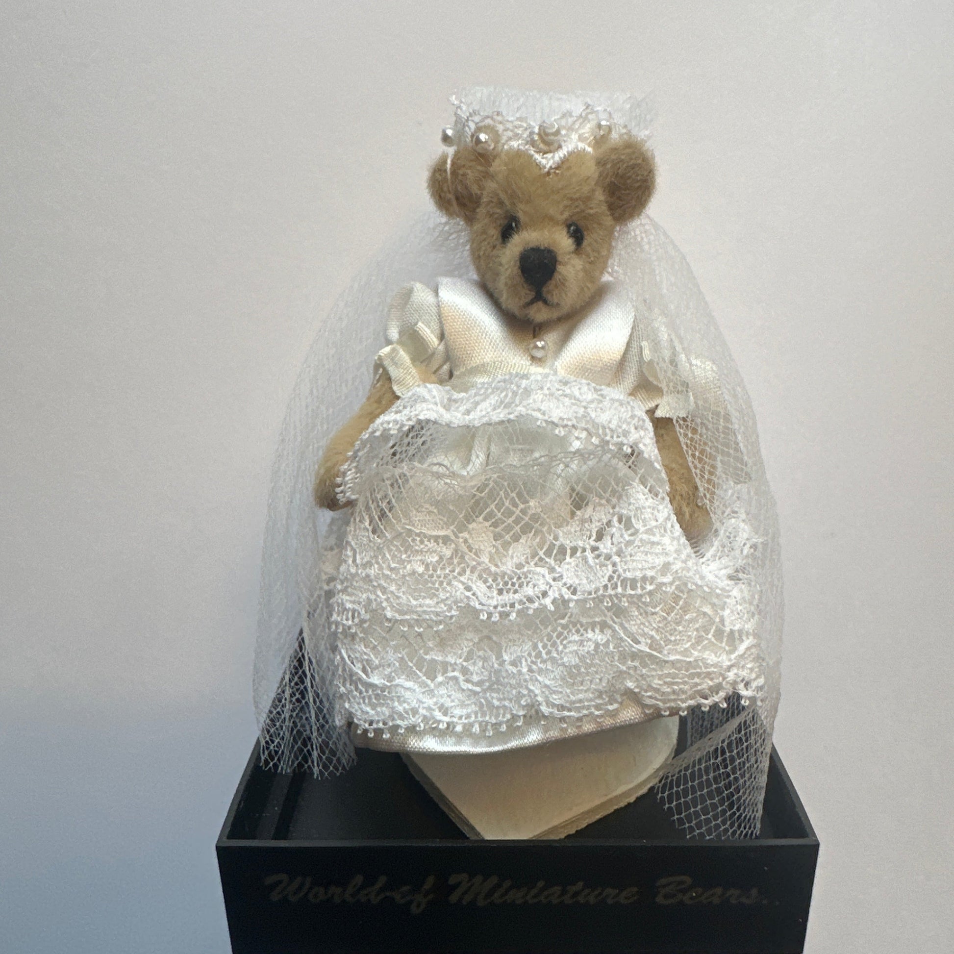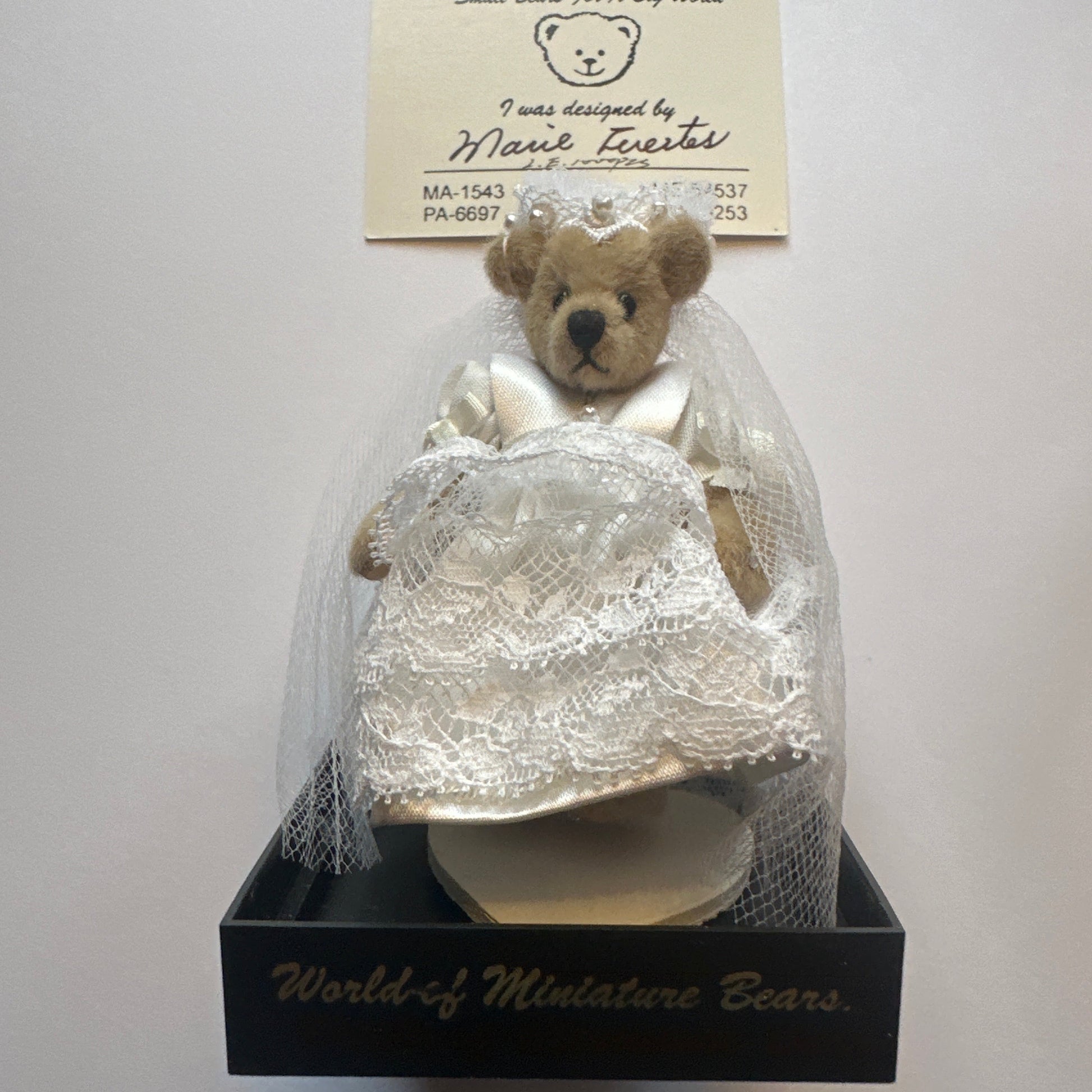 Adorable small bear named June, approximately 2.75” tall, made by the talented artist Marie Fuertes for World of Miniature Bears. Crafted with soft velvet, this miniature bear is dressed in delicate clothing, beautifully detailed, and lightweight. Comes in its original box with a small certificate of authenticity from the company. A charming and high-quality collectible, perfect for miniature bear enthusiasts and dollhouse displays.