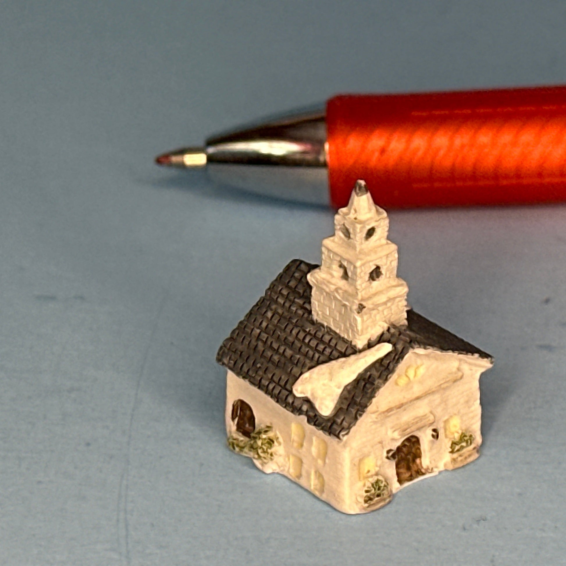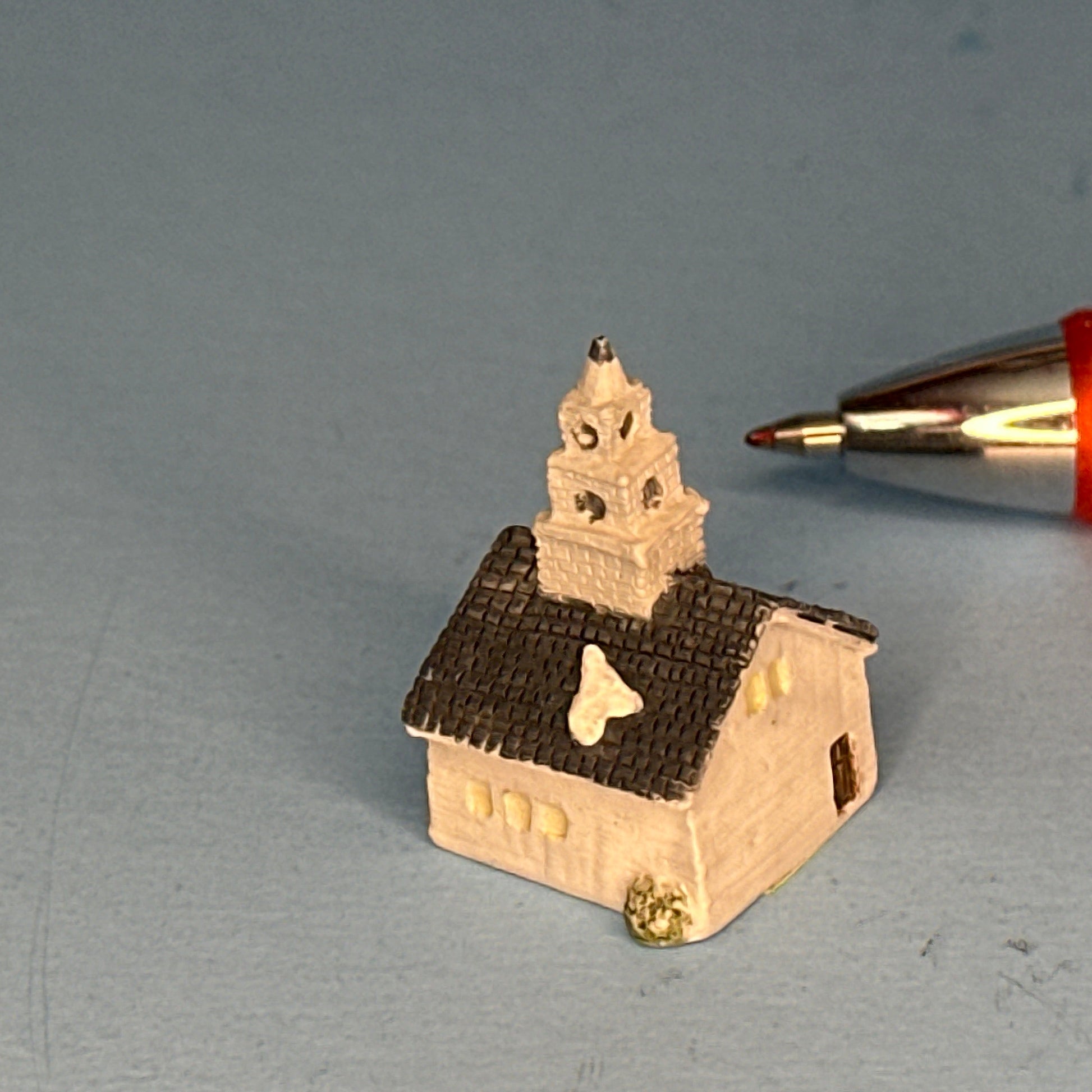 A charming miniature church featuring a gray roof dusted with snow, a chimney, and beautifully painted doors. This delicate piece captures the cozy spirit of winter and adds a touch of warmth and character to any dollhouse or holiday display.