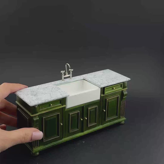 Vintage Green with gold trimming Victorian quality Kitchen sink unit counter with shelf metal sink top 1:12 dollhouse miniature