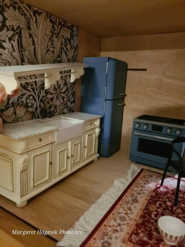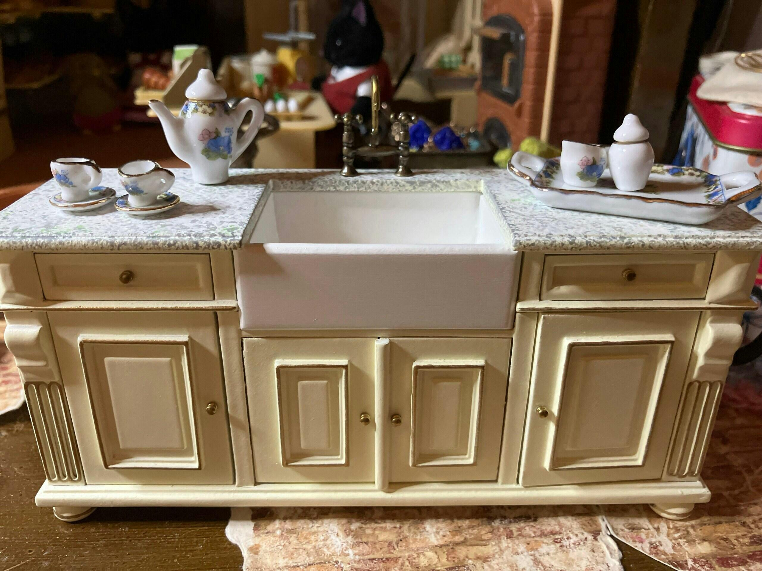 This vintage-style Victorian kitchen sink unit for 1:12 scale dollhouses showcases a pristine white finish with delicate gold trimming. Featuring a detailed metal sink top and a convenient shelf, this high-quality miniature blends timeless elegance with practicality, enhancing the sophistication of your dollhouse kitchen.